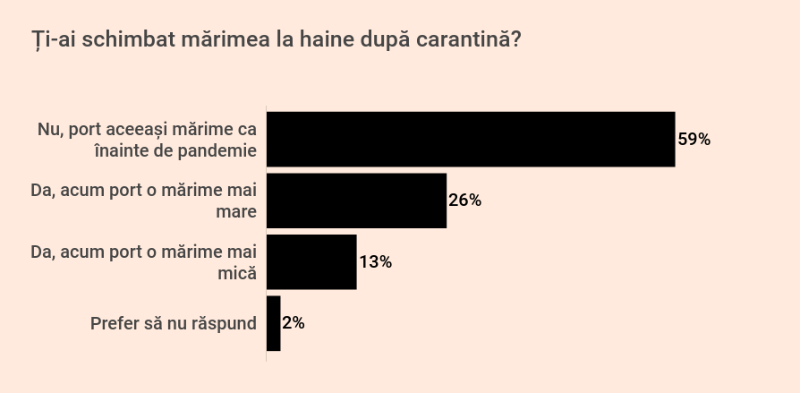 Întrebați dacă au schimbat sau nu măsura la haine față de acum 12 luni, mai mult de jumătate dintre participanții la studiu (59%) au spus că poartă aceeași măsură la piese de îmbrăcăminte.