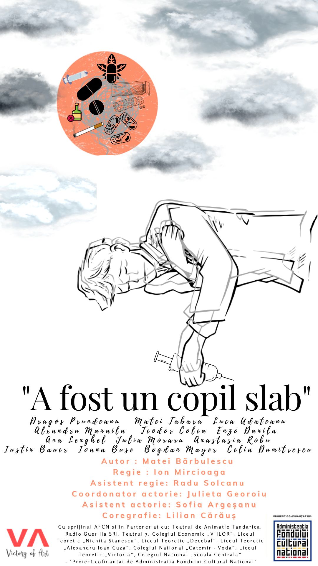 Proiectul „A fost un copil slab” este realizat cu sprijinul AFCN în Parteneriat cu: Teatrul 7, Teatrul de Animație Țăndărică, Radio Guerilla SRl, Colegiul Economic „VIILOR”, Liceul Teoretic „Nichita Stănescu”, Liceul Teoretic „Decebal”, Liceul Teoretic „Alexandru Ioan Cuza”, Colegiul Național „Catemir – Vodă”, Liceul Teoretic „Victoria”, Colegiul Național „Școala Centrală” – „Proiect cofinanțat de Administrația Fondului Cultural Național”.