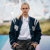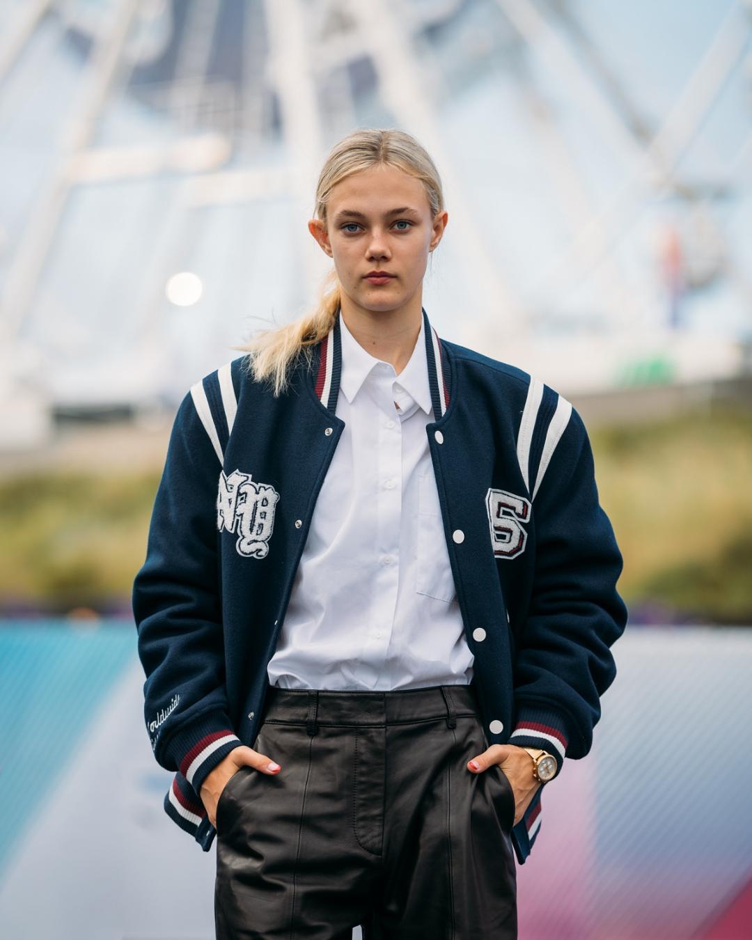 31 august: o jachetă bomber varsity cu logo, asortată cu o cămașă din poplin, pantaloni culottes din piele și ghete Chelsea din piele lăcuită.