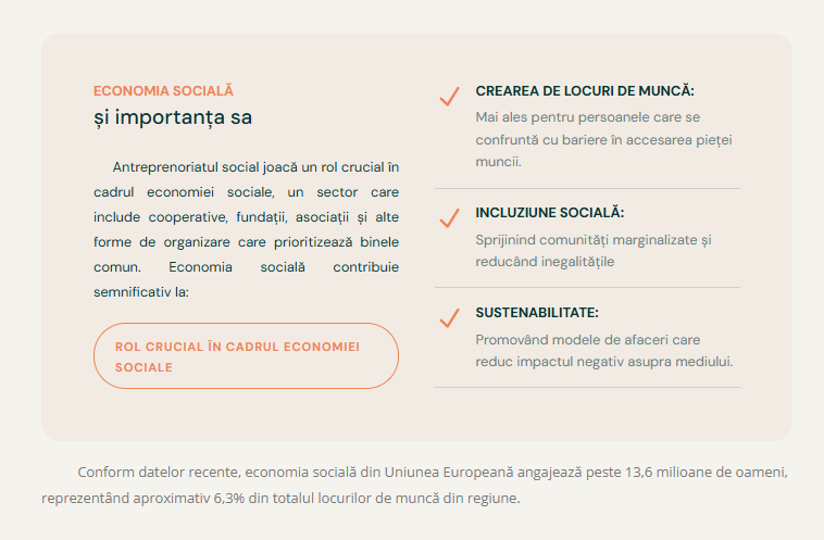 Conform datelor recente, economia socială din Uniunea Europeană angajează peste 13,6 milioane de oameni, reprezentând aproximativ 6,3% din totalul locurilor de muncă din regiune.
