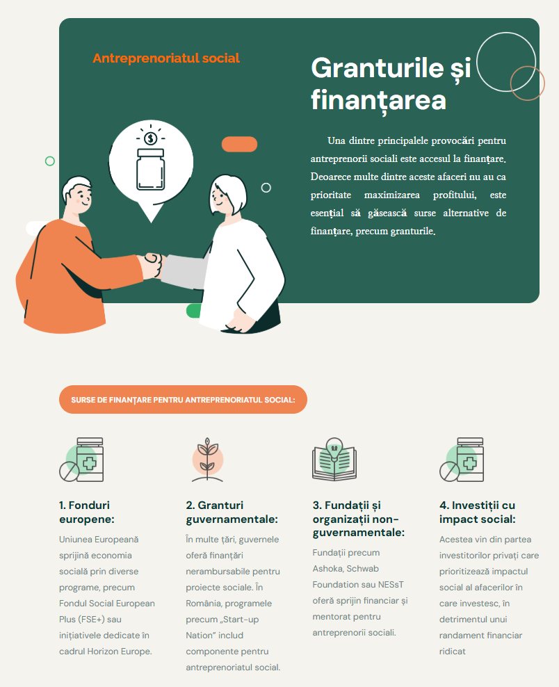 - Fundații și organizații non-guvernamentale: Fundații precum Ashoka, Schwab Foundation sau NESsT oferă sprijin financiar și mentorat pentru antreprenorii sociali.
