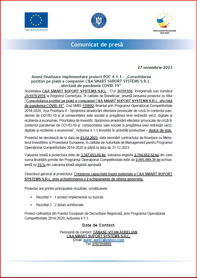 Anunț finalizare implementare proiect POC 4.1.1 - „Consolidarea poziției pe piață a companiei C&A SMART SUPORT SYSTEMS S.R.L. afectată de pandemia COVID-19”
