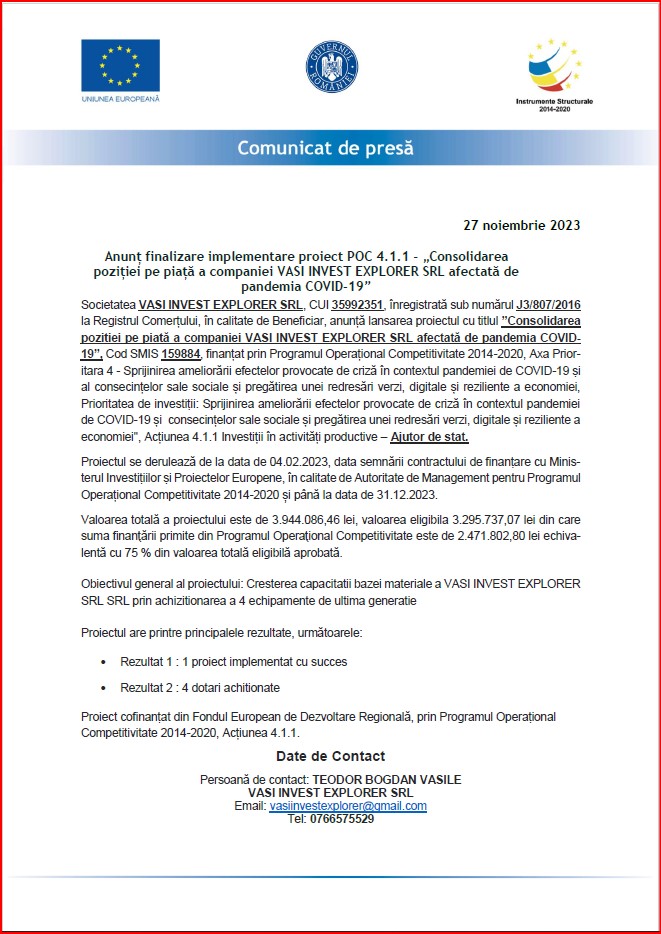 Anunț finalizare implementare proiect POC 4.1.1 - „Consolidarea poziției pe piață a companiei VASI INVEST EXPLORER SRL afectată de pandemia COVID-19”
