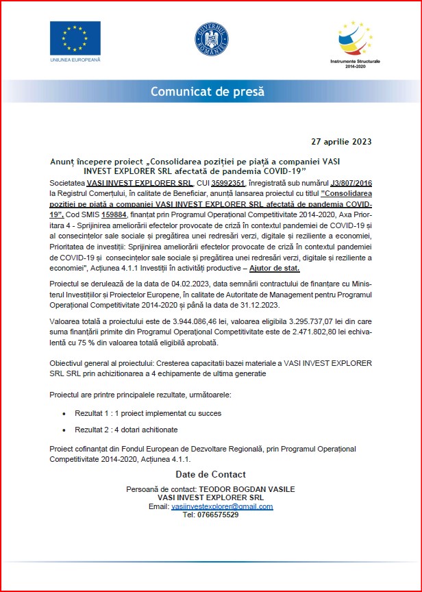 Societatea VASI INVEST EXPLORER SRL, CUI 35992351, înregistrată sub numărul J3/807/2016 la Registrul Comerțului, în calitate de Beneficiar, anunță lansarea proiectul cu titlul ”Consolidarea poziției pe piață a companiei VASI INVEST EXPLORER SRL afectată de pandemia COVID-19”, Cod SMIS 159884, finanțat prin Programul Operațional Competitivitate 2014-2020, AxaPrioritara 4 – Sprijinirea ameliorării efectelor provocate de criză încontextul pandemiei de COVID-19 și al consecințelor sale sociale și pregătirea unei redresări verzi, digitale și reziliente a economiei, Prioritatea de investiții: Sprijinirea ameliorării efectelor provocate de criză în contextul pandemiei de COVID-19 și consecințelor sale sociale și pregătirea unei redresări verzi, digitale și reziliente a economiei”, Acțiunea 4.1.1 Investiții în activități productive – Ajutor de stat.