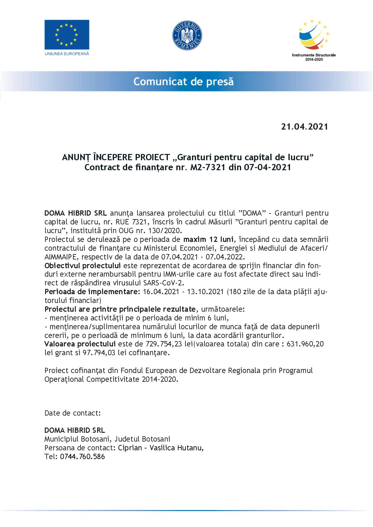 DOMA HIBRID SRL anunța lansarea proiectului cu titlul ”DOMA” – Granturi pentru capital de lucru, nr. RUE 7321, înscris în cadrul Măsurii ”Granturi pentru capital de lucru”, instituită prin OUG nr. 130/2020.
