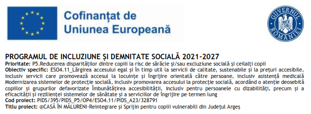 ASOCIATIA PATRONALA CENTRUL REGIONAL DE ANTREPRENORIAT URBAN („CRAU”) REGIUNEA SUD- MUNTENIA, în parteneriat cu ASOCIATIA ” ACOPERAMANTUL MAICII DOMNULUI ” și UAT MALURENI , implementează începând cu data de 01.03.2025, proiectul ”CASĂ ÎN MĂLURENI-Reintegrare și Sprijin pentru copiii vulnerabili din Județul Argeș” cod SMIS 328791, o inițiativă ce are ca scop asigurarea de intervenții integrate prin furnizarea serviciilor de sprijin în vederea prevenirii riscului de separare a copilului de familia sa. Proiect ul vizează dezvoltarea și implementarea unui program integrat de sprijin pentru un număr de 266 de copii din jud Argeș, Comuna Mălureni care se concentrează pe prevenirea separării copilului de familie, evaluarea și reintegrarea copiilor în situații de risc și oferirea de servicii personalizate de sprijin, inclusiv consiliere, asistență medicală, recuperare și promovarea integrării familiale și comunitare pentru copiii din grupul-țintă vizat.