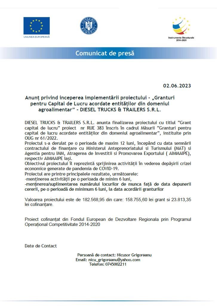 Anunț privind inceperea implementării proiectului - „Granturi pentru Capital de Lucru acordate entităților din domeniul agroalimentar” – DIESEL TRUCKS & TRAILERS S.R.L.