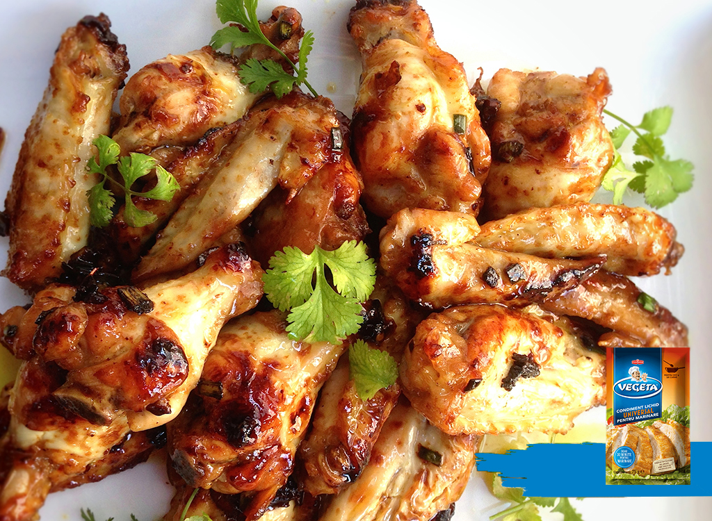 Dar, pana sa faci plating-ul, hai sa revenim la ingredientul secret, Vegeta condiment lichid Universal pentru marinare. Daca a trecut o jumatate de ora, marinada a avut timp berechet sa patrunda in aripioare si sa le fragezeasca. Sunt bune de pus pe gratar si nici nu mai au nevoie de prea mult timp pe jarul incins – datorita marinadei carnea se va gati mai repede iar gustul va fi unul unic, bine evidentiat de mixul savuros de condimente.