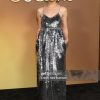Rose Byrne a strălucit într-o rochie personalizată Calvin Klein Collection, cu o siluetă empire și aplicații tip oglindă pe toată lungimea, care captează lumina în fiecare mișcare. Buzunarele fine integrate și detaliile de drapaj amplificat aduc o notă sculpturală și modernă, semnătură a eleganței Calvin Klein pe covorul roșu.