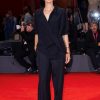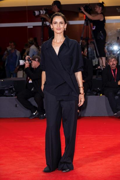 Pentru covorul roșu, Valentina a purtat look-ul 47 din colecția Calvin Klein Collection: o cămașă oversized neagră, cu două rânduri de nasturi, din lână, asortată cu pantaloni evazați din lână și mocasini negri din piele, slip-on.