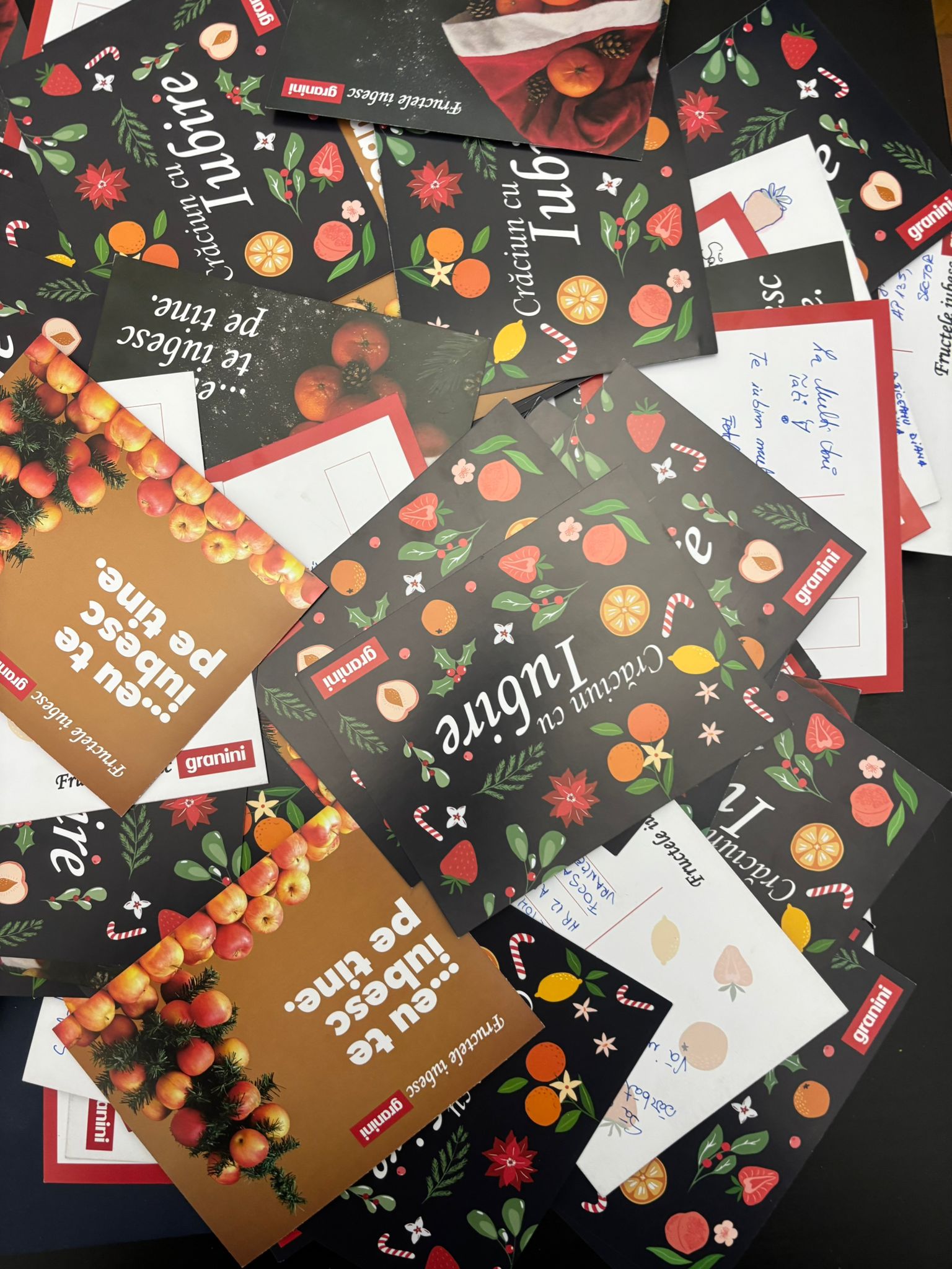 În perioada 6-21 decembrie, cornerul Granini din centrul comercial „ParkLake Shopping Center” din București a avut mii de vizitatori, dornici să facă fotografii cu bradul împodobit cu fructe colorate sau să completeze cu mesaje emoționante, urări de sărbătoare, ori, pur și simplu, cu un gând bun, una dintre cărțile poștale festive pregătite de Granini, pentru a aduce bucurie cuiva special. În total, peste 800 de felicitări au fost expediate cu ajutorul Granini, atât în țară (763), cât și în străinătate (49), către persoane dragi, acestea simțind astfel mai intens spiritul sărbătorilor de iarnă și bucurându-se, în același timp, să primească o carte poștală în stil clasic.