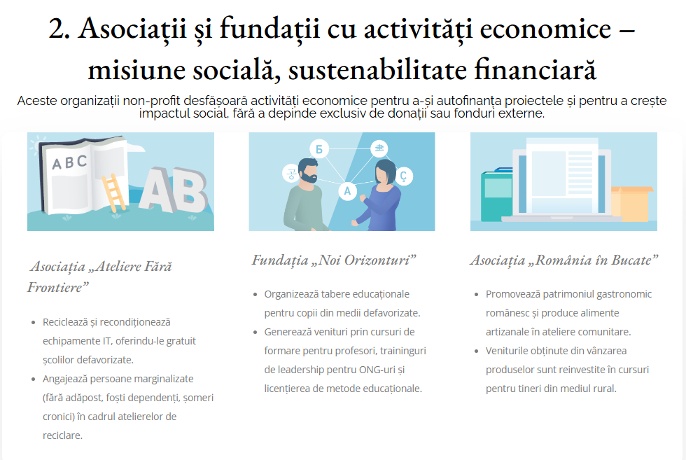 Aceste organizații non-profit desfășoară activități economice pentru a-și autofinanța proiectele și pentru a crește impactul social, fără a depinde exclusiv de donații sau fonduri externe.