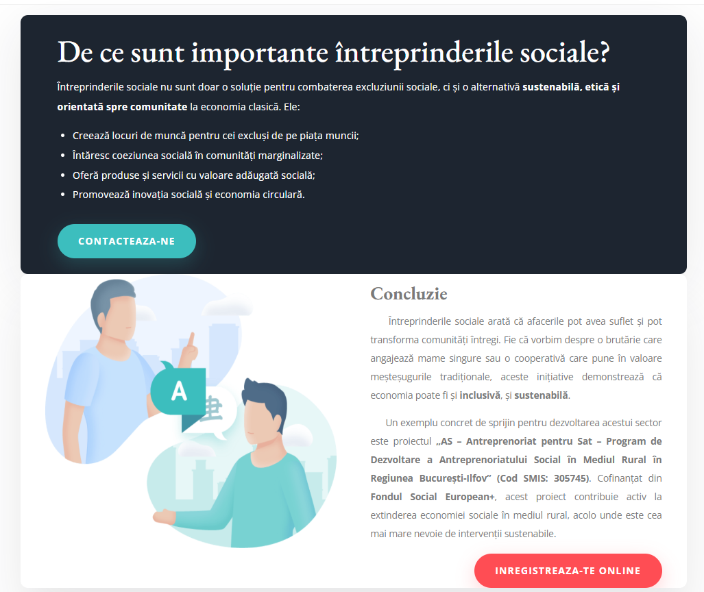 Un exemplu concret de sprijin pentru dezvoltarea acestui sector este proiectul „AS – Antreprenoriat pentru Sat – Program de Dezvoltare a Antreprenoriatului Social în Mediul Rural în Regiunea București-Ilfov” (Cod SMIS: 305745). Cofinanțat din Fondul Social European+, acest proiect contribuie activ la extinderea economiei sociale în mediul rural, acolo unde este cea mai mare nevoie de intervenții sustenabile.