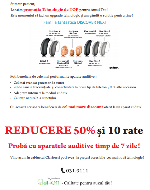 Din grijă pentru sănătatea urechii tale, echipa Clarfon ţi-a pregătit cele mai bune oferte la protezele auditive, pe care până în momentul actual poate nu ți le-ai permis. Da, auzul tău este important pentru tine și pentru noi! Îți suntem alături! Iar până pe data de 15 iunie avem o mega surpriză pentru tine sau persoanele importante din familia ta.