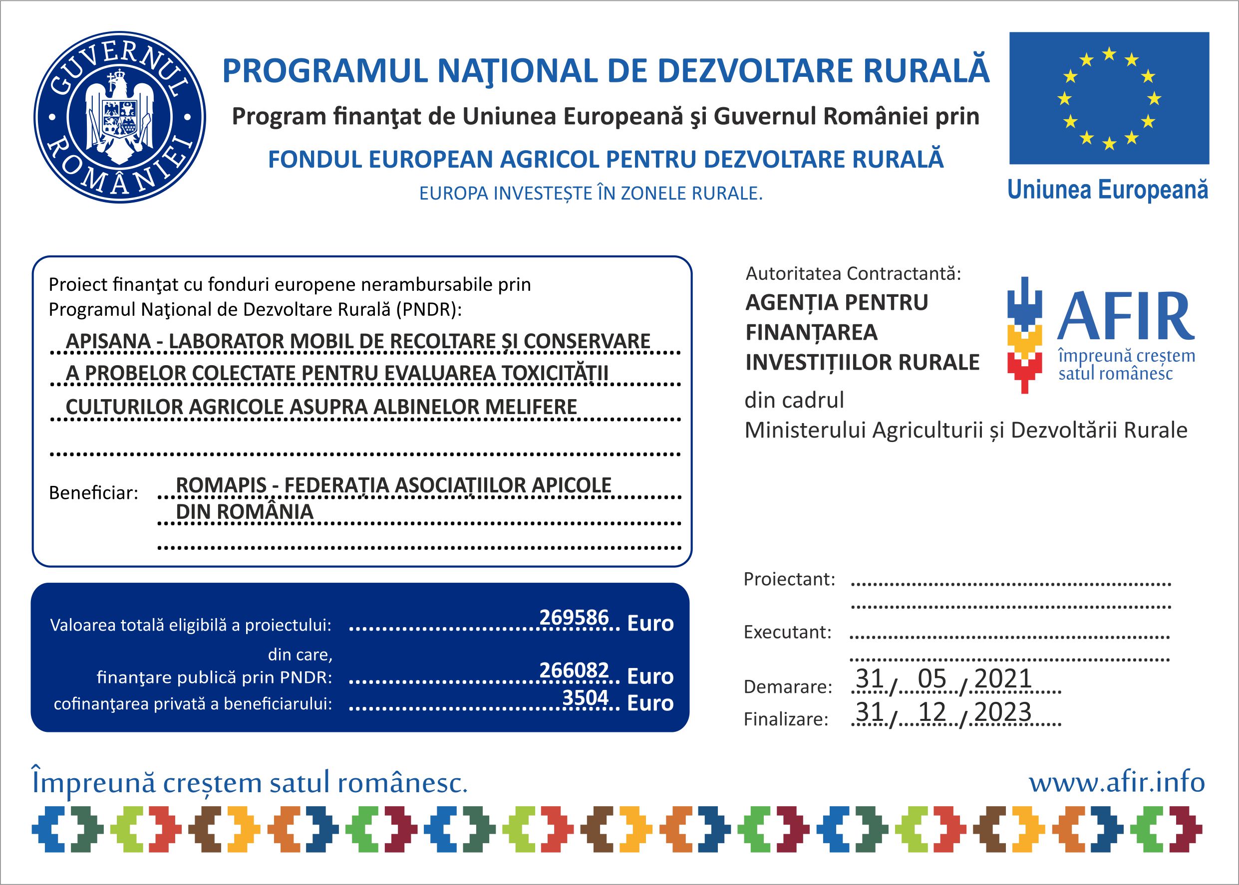 În data de 26.08.2023 va avea loc conferința de inchidere a proiectului Apisana – laborator mobil de recoltare și conservare a probelor colectate pentru evaluarea toxicității culturilor agricole asupra albinelor melifere, proiect finanţat cu fonduri europene nerambursabile prin Programul Național de Dezvoltare Rurală (PNDR) 2014-2020 și implementat de ROMAPIS – FEDERAȚIA ASOCIAȚIILOR APICOLE DIN ROMÂNIA. Evenimentul va avea loc la Hotel Padis, Băile Felix, sambata 26 august 2023, începând cu ora 09:30 și va marca finalizarea proiectului. În cadrul evenimentului vor fi prezentate activităţile şi rezultatele obținute în urma implementării proiectului. Participanții vor fi beneficiari ai proiectului, reprezentanți ai celor mai importante asociații de apicultori, membri ai echipei de implementare, mass media.