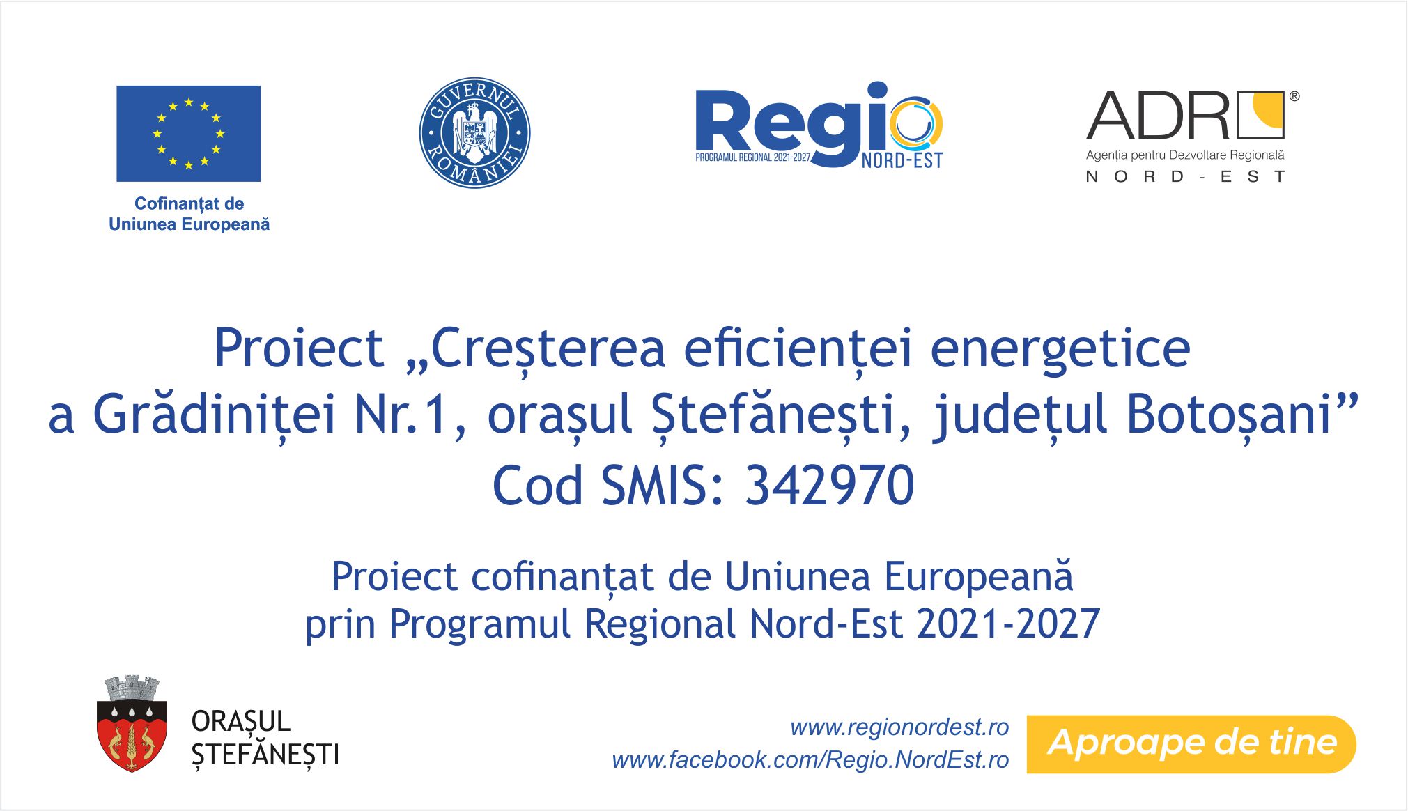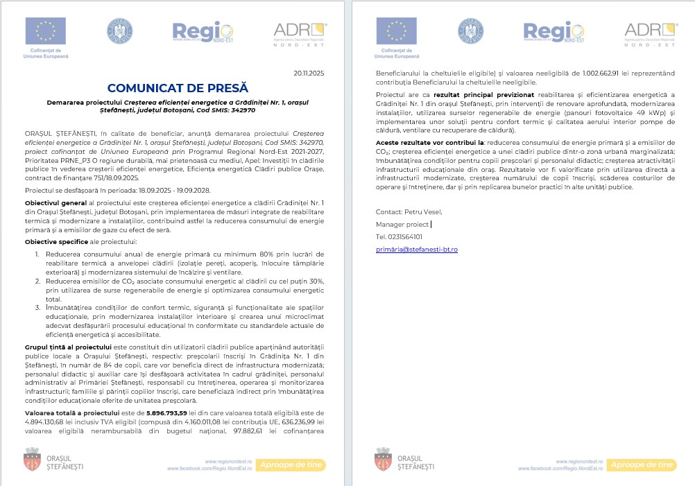 ORAȘUL ȘTEFĂNEȘTI, în calitate de beneficiar, anunță demararea proiectului Creșterea eficienței energetice a Grădiniței Nr. 1, orașul Ștefănești, județul Botoșani, Cod SMIS: 342970, proiect cofinanțat de Uniunea Europeană prin Programul Regional Nord-Est 2021-2027, Prioritatea PRNE_P3 O regiune durabilă, mai prietenoasă cu mediul, Apel: Investiții în clădirile publice în vederea creșterii eficienței energetice, Eficiența energetică Clădiri publice Orașe, contract de finanțare 751/18.09.2025.
