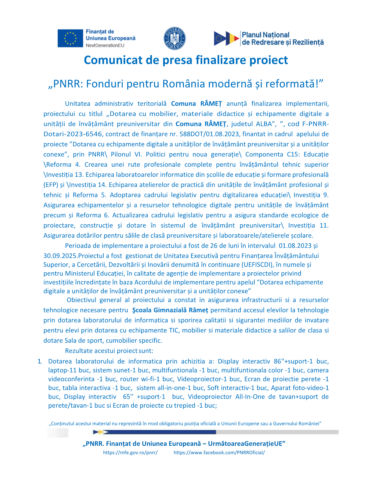 Unitatea administrativ teritorială Comuna RÂMEȚ anunță finalizarea implementarii, proiectului cu titlul „Dotarea cu mobilier, materiale didactice și echipamente digitale a unității de învățământ preuniversitar din Comuna RÂMEȚ, judetul ALBA”, ”, cod F-PNRR-Dotari-2023-6546, contract de finanțare nr. 588DOT/01.08.2023, finantat in cadrul apelului de proiecte ”Dotarea cu echipamente digitale a unităților de învățământ preuniversitar și a unităților conexe”, prin PNRR\ Pilonul VI. Politici pentru noua generație\ Componenta C15: Educație \Reforma 4. Crearea unei rute profesionale complete pentru învățământul tehnic superior \Investiția 13. Echiparea laboratoarelor informatice din școlile de educație și formare profesională (EFP) și \Investiția 14. Echiparea atelierelor de practică din unitățile de învățământ profesional și tehnic și Reforma 5. Adoptarea cadrului legislativ pentru digitalizarea educației\ Investiția 9. Asigurarea echipamentelor și a resurselor tehnologice digitale pentru unitățile de învățământ precum și Reforma 6. Actualizarea cadrului legislativ pentru a asigura standarde ecologice de proiectare, construcție și dotare în sistemul de învățământ preuniversitar\ Investiția 11. Asigurarea dotărilor pentru sălile de clasă preuniversitare și laboratoarele/atelierele școlare.