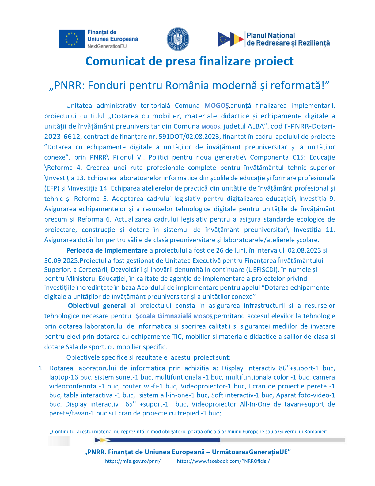 Unitatea administrativ teritorială Comuna MOGOŞ,anunță finalizarea implementarii, proiectului cu titlul „Dotarea cu mobilier, materiale didactice și echipamente digitale a unității de învățământ preuniversitar din Comuna MOGOŞ, judetul ALBA”, cod F-PNRR-Dotari-2023-6612, contract de finanțare nr. 591DOT/02.08.2023, finantat în cadrul apelului de proiecte ”Dotarea cu echipamente digitale a unităților de învățământ preuniversitar și a unităților conexe”, prin PNRR\ Pilonul VI. Politici pentru noua generație\ Componenta C15: Educație \Reforma 4. Crearea unei rute profesionale complete pentru învățământul tehnic superior \Investiția 13. Echiparea laboratoarelor informatice din școlile de educație și formare profesională (EFP) și \Investiția 14. Echiparea atelierelor de practică din unitățile de învățământ profesional și tehnic și Reforma 5. Adoptarea cadrului legislativ pentru digitalizarea educației\ Investiția 9. Asigurarea echipamentelor și a resurselor tehnologice digitale pentru unitățile de învățământ precum și Reforma 6. Actualizarea cadrului legislativ pentru a asigura standarde ecologice de proiectare, construcție și dotare în sistemul de învățământ preuniversitar\ Investiția 11. Asigurarea dotărilor pentru sălile de clasă preuniversitare și laboratoarele/atelierele școlare.