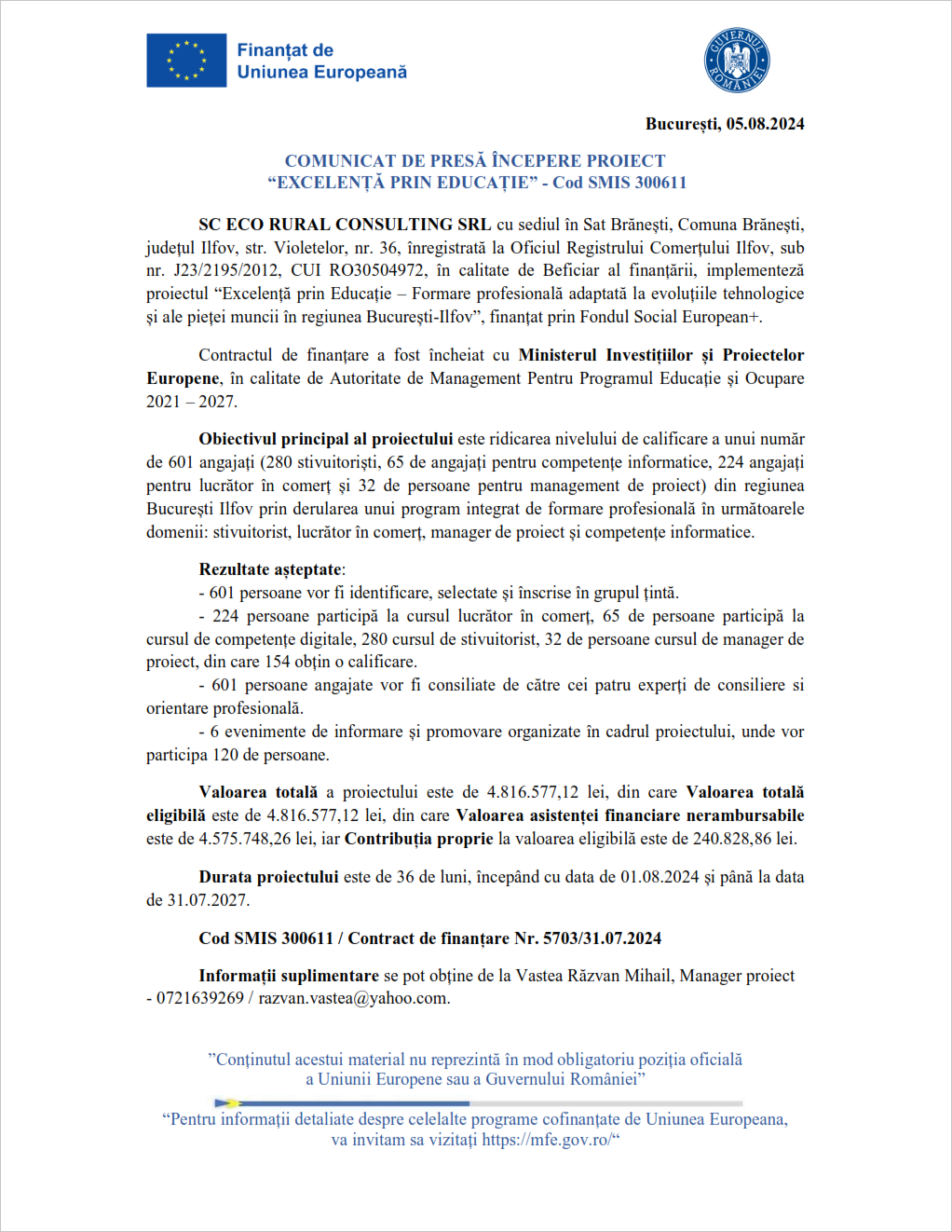 Excelență prin Educație, Cod SMIS 300611, Contract finanțare Nr. 5703/31.07.2024, MIPE