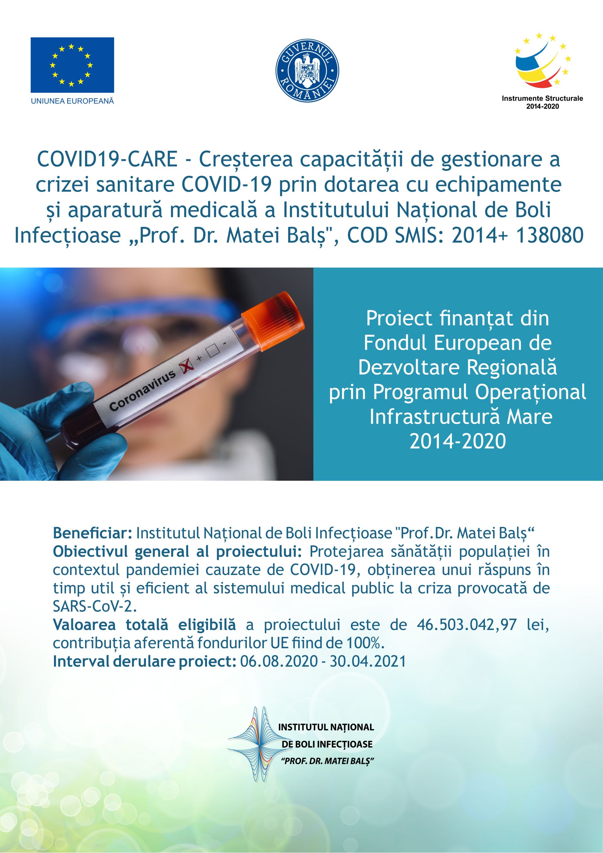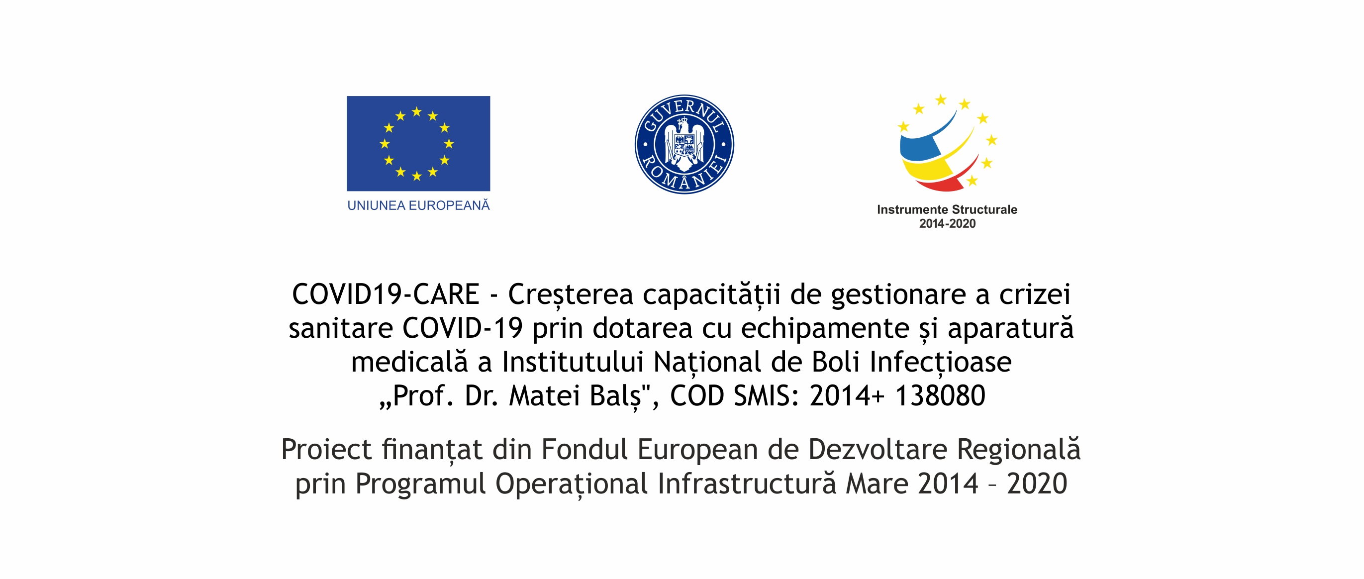 Institutul National de Boli Infectioase „Prof.Dr. Matei Bals”, anunta demararea proiectului “COVID19-CARE – Cresterea capacitatii de gestionare a crizei sanitare COVID-19 prin dotarea cu echipamente si aparatura medicala a Institutului National de Boli Infectioase „Prof. Dr. Matei Bals”, COD SMIS: 2014+ 138080, proiect finantat din Fondul European de Dezvoltare Regionala prin Programul Operational Infrastructura Mare 2014-2020.
