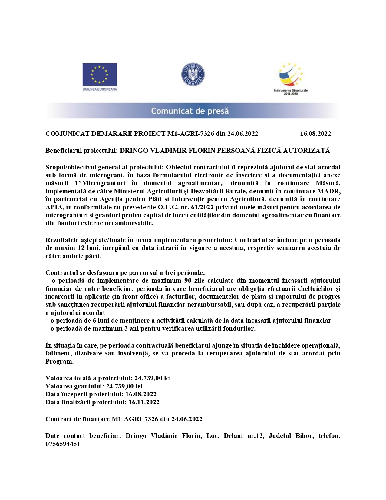 COMUNICAT DEMARARE PROIECT M1-AGRI-7326 DIN 24.06.2022