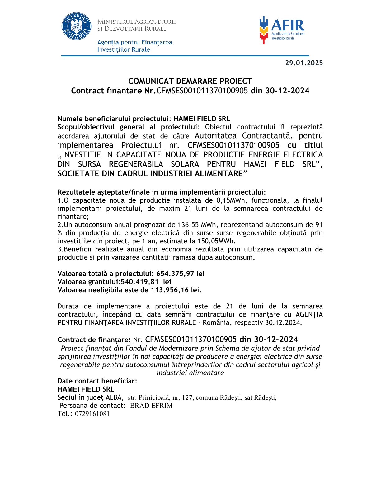 Numele beneficiarului proiectului: HAMEI FIELD SRL
