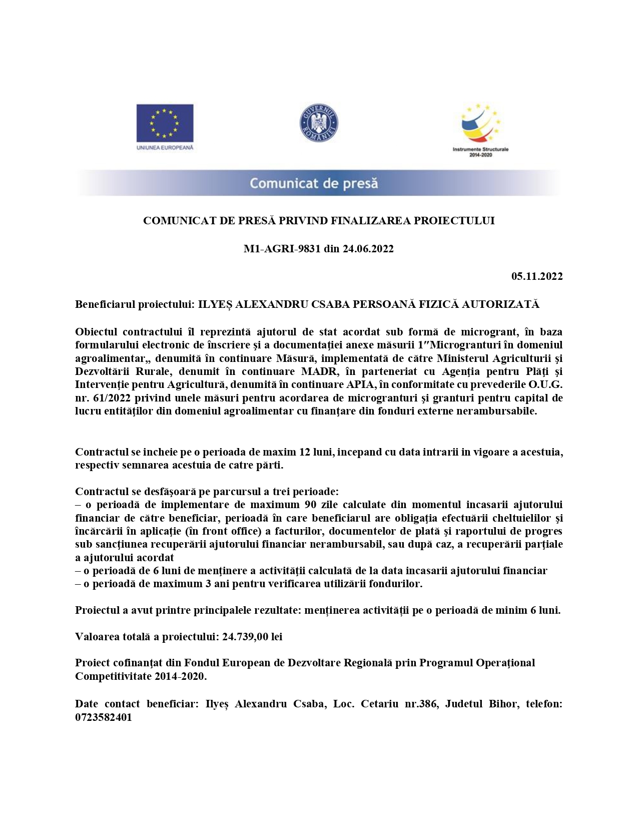 Date contact beneficiar: Ilyeș Alexandru Csaba, Loc. Cetariu nr.386, Judetul Bihor, telefon: 0723582401