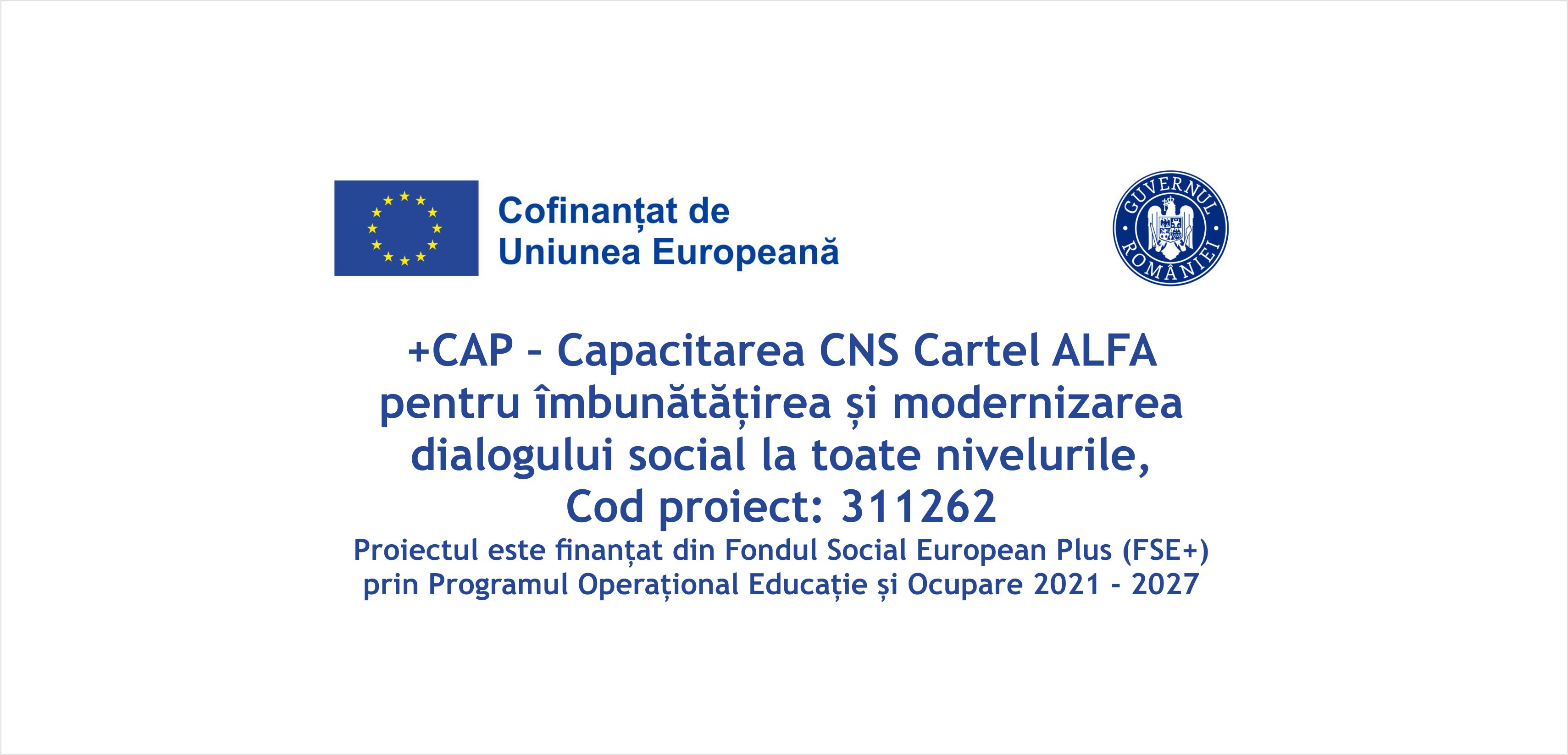 Proiectul „+CAP – Capacitarea CNS Cartel ALFA pentru îmbunătățirea și modernizarea dialogului social la toate nivelurile”, cod proiect 311262, este implementat de către CONFEDERAȚIA NAȚIONALĂ SINDICALĂ – „CARTEL ALFA„, în calitate de beneficiar, în parteneriat cu FEDERAȚIA „SOLIDARITATEA SANITARĂ” DIN ROMÂNIA.
