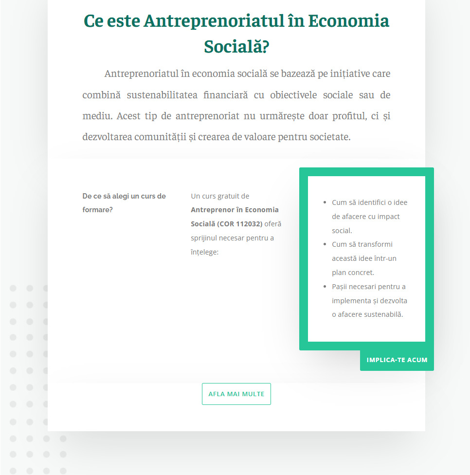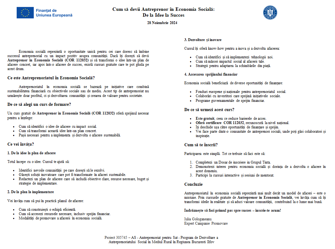 Economia socială reprezintă o oportunitate unică pentru cei care doresc să îmbine succesul antreprenorial cu un impact pozitiv asupra comunității. Dacă îți dorești să devii Antreprenor în Economia Socială (COR 112032) și să transformi o idee într-un plan de afacere concret, iar apoi într-o afacere de succes, există cursuri gratuite care te pot ghida pe acest drum.