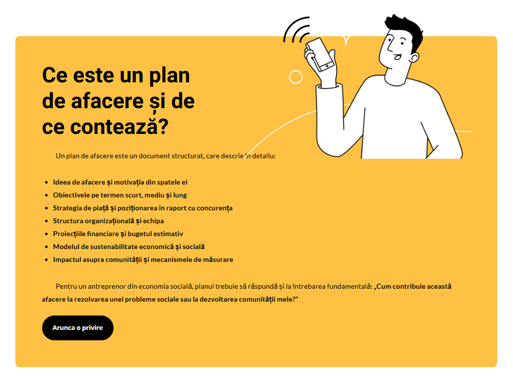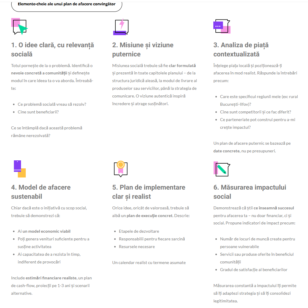 Pentru un antreprenor din economia socială, planul trebuie să răspundă și la întrebarea fundamentală: „Cum contribuie această afacere la rezolvarea unei probleme sociale sau la dezvoltarea comunității mele?”