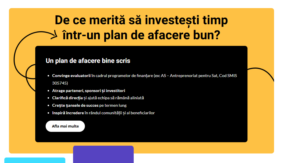 - Responsabilitate socială și implicare locală: Afacerea trebuie să răspundă unor nevoi reale ale comunității și să contribuie la dezvoltarea acesteia.