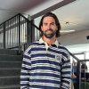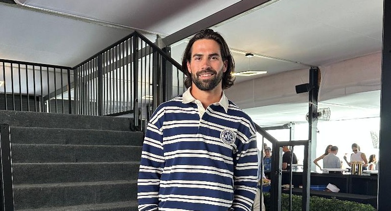Sam Hartman a purtat un tricou polo de rugby cu dungi albastre și albe, asortat cu pantaloni conici relaxați de culoarea lemnului de santal și adidași albi din piele întoarsă, toate din colecția de vară 2026 TOMMY HILFIGER.