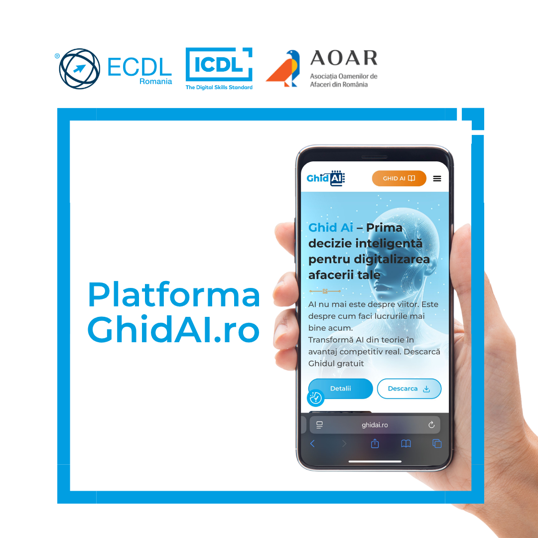 ECDL Romania – lider în certificarea competențelor digitale la nivel național – și Asociația Oamenilor de Afaceri din România (AOAR) – vocea mediului de afaceri responsabil – au creat GhidAI.ro pentru a susține transformarea digitală a IMM-urilor din România.