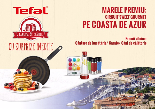 Tefal redeschide pentru al treilea an Fabrica de Clătite, campania națională care te înscrie în concurs pentru sute de premii! Cumpără între 1 martie și 20 aprilie orice tigaie, cratiță sau oală Tefal, înscrie-te în concurs prin SMS la 1793 sau pe fabricadeclatite.tefal.ro și poți câștiga zilnic: cântare de bucătărie, carafe și căni de călătorie! Sau marele premiu: un circuit Sweet Gourmet pe Coasta de Azur.