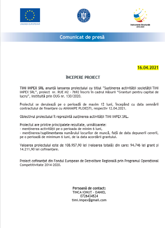 TIMI IMPEX SRL anunță lansarea proiectului cu titlul ”Susținerea activității societății TIMI IMPEX SRL”, proiect nr. RUE M2 – 7692 înscris în cadrul Măsurii ”Granturi pentru capital de lucru”, instituită prin OUG nr. 130/2020.