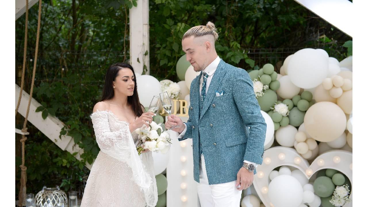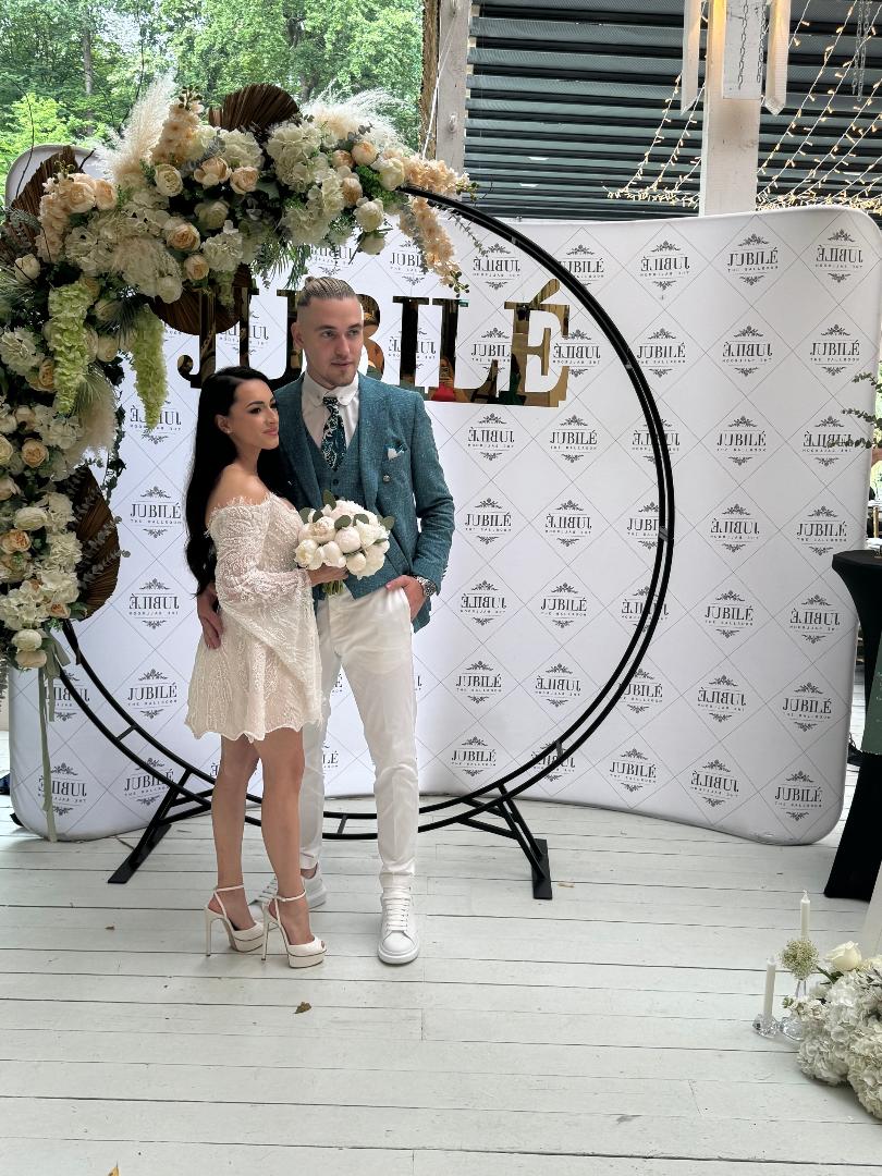 Tinerii miri nu au scăpat de ploaie nici la cununia civilă și nici la petrecerea organizată într-o locație de fițe de pe malul lacului Snagov. Acest lucru însă nu i-a împiedicat să se plimbe cu barca, să joace tradiționalul dans al șervetelor și să se distreze alături de invitații lor într-o locație de vis, cu un meniu pe măsură și un decor pe alb-verde, exact așa cum și-au dorit.