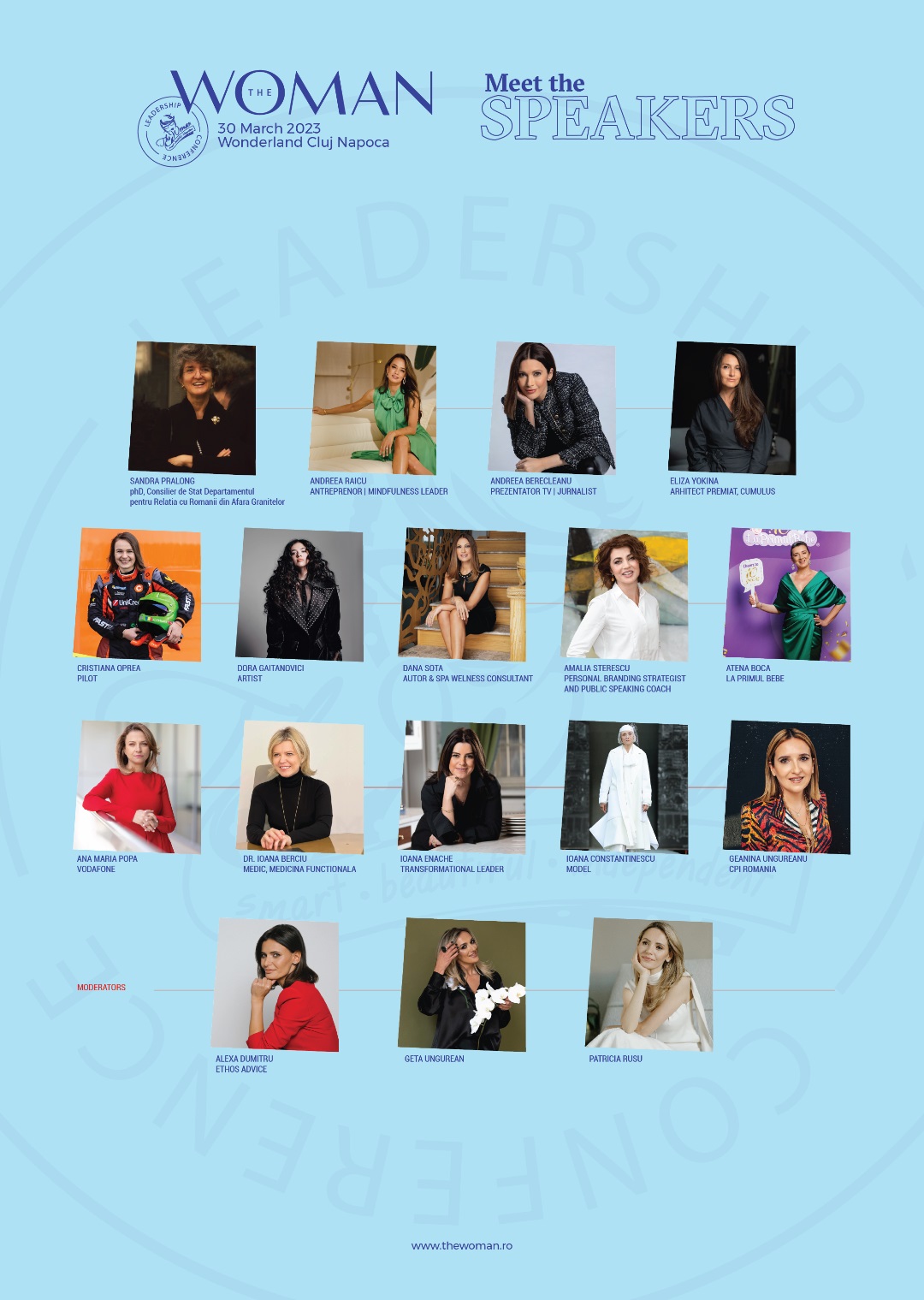 Speakerii care vor lua cuvântul sunt: Atena Boca, fondatoarea comunității La Primul Bebe, Amalia Sterescu, Personal branding strategist and public speaking coach, Eliza Yokina, arhitect premiat parte din Cumulus, Geanina Ungureanu, Head of retail CPI Property Group Romania și Ana Maria Popa, reprezentând Vodafone.
