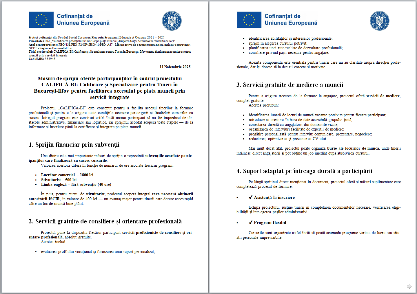 Măsuri de sprijin oferite participanților în cadrul proiectului CALIFICĂ-BI: Calificare și Specializare pentru Tineri în București-Ilfov pentru facilitarea accesului pe piata muncii prin servicii integrate