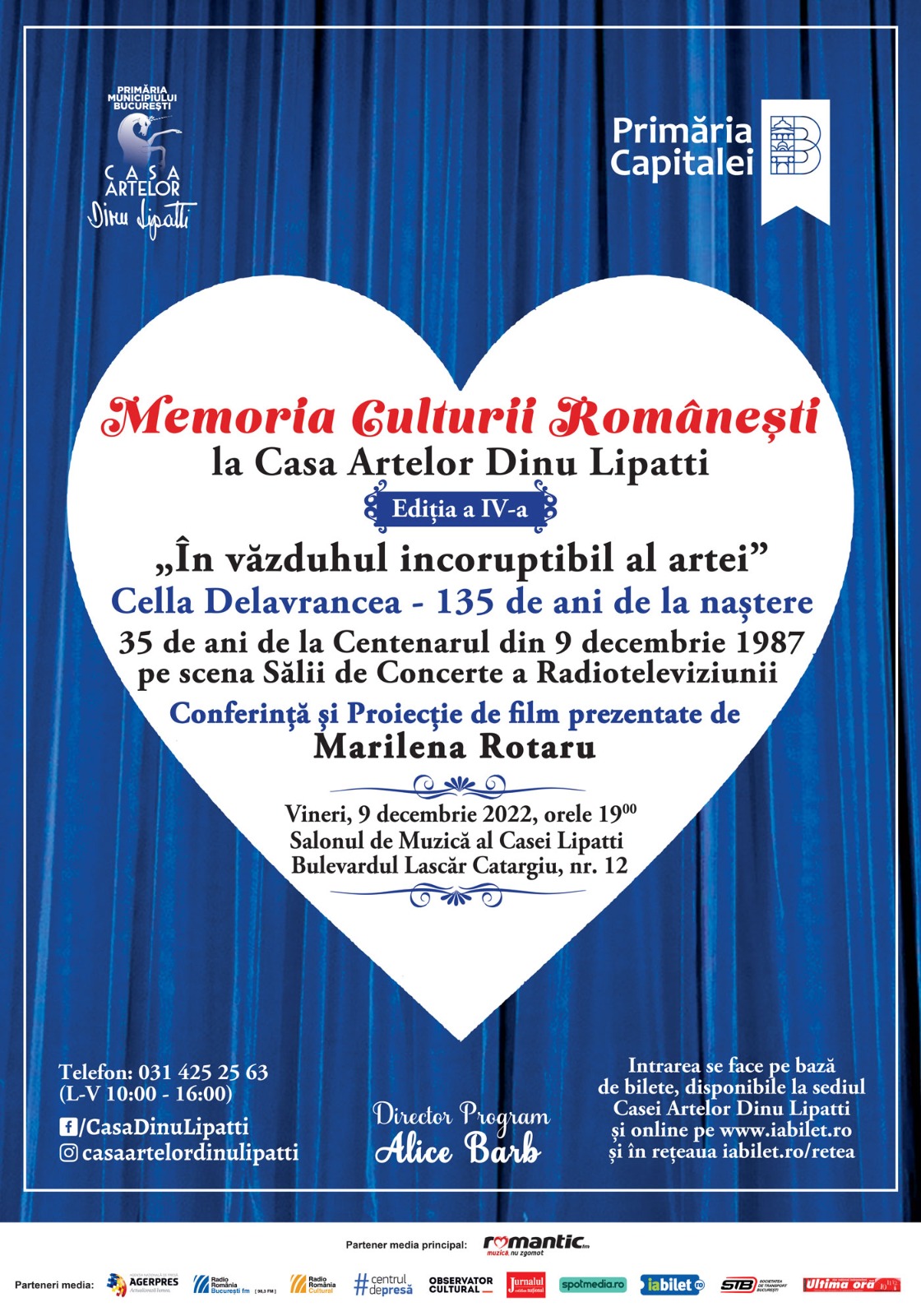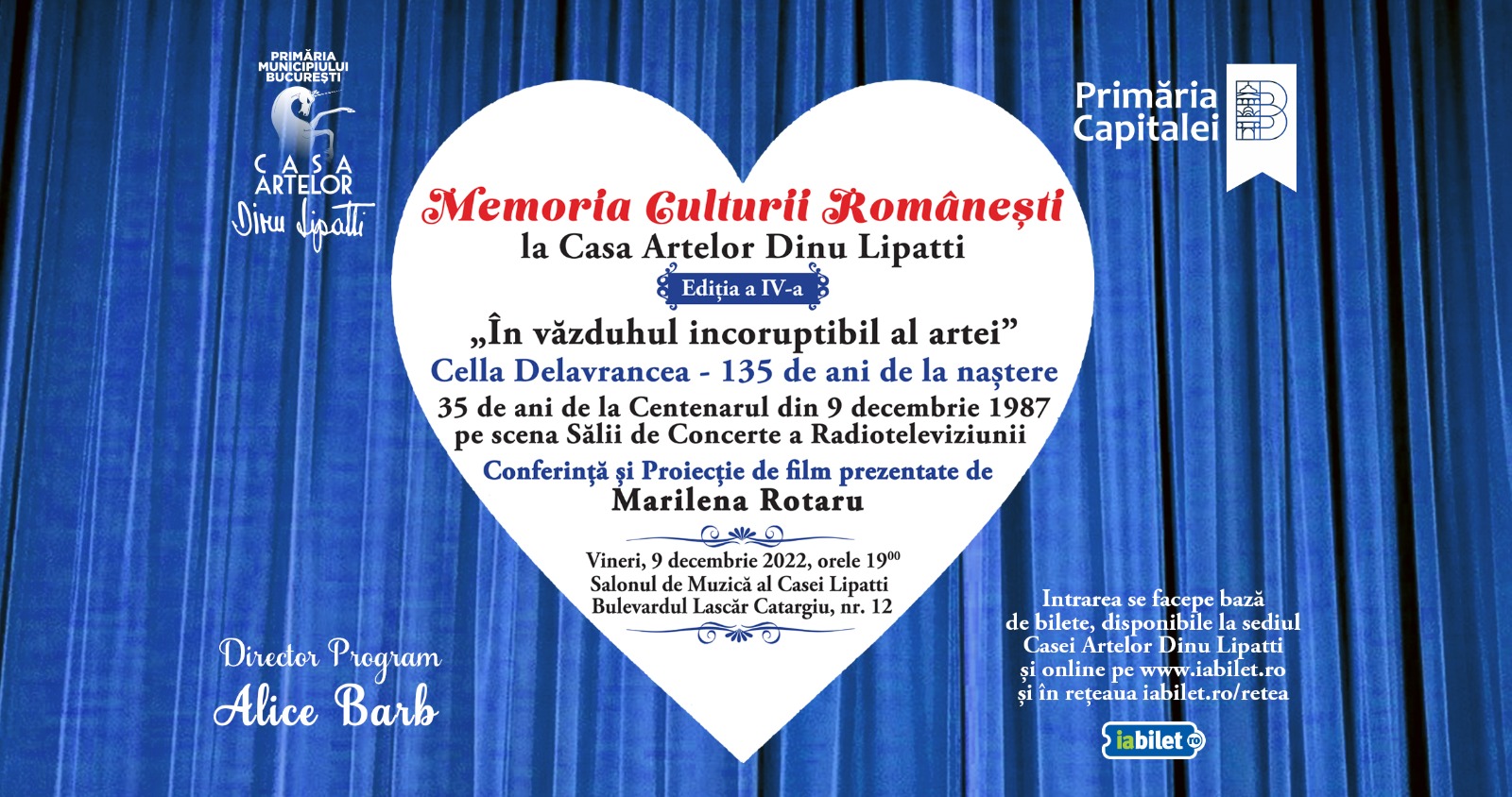 Publicul va avea ocazia să participe la Conferința susținută de invitata noastră, în cadrul căreia va prezenta filmul „În văzduhul incoruptibil al artei” pentru a aduce un omagiu personalității excepționale a Celei Delavrancea, la 35 de ani de la Centenarul din 9 decembrie 1987, unde în Studioul Mihail Jora al Radiodifuziunii Române a avut loc concertul-eveniment inițiat de jurnalista Marilena Rotaru. Pe scenă au urcat atunci mari personalități culturale și muzicieni ai României, pentru a îi aduce un Laudațio îndrăgitei pianiste și omului de cultură: Academician Zoe Dumitrescu – Bușulenga, Academician Șerban Cioculescu, dirijorul și compozitorul Marin Constatin, pianistul Dan Grigore, criticul muzical Iosif Sava.