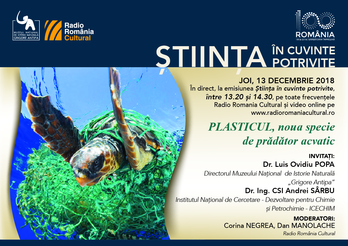 Muzeul Național de Istorie Naturală „Grigore Antipa” în parteneriat cu Radio România Cultural vă invită joi, 13 decembrie 2018, la o emisiune-dezbatere despre efectele dezastruoase ale plasticului asupra ecosistemului acvatic.