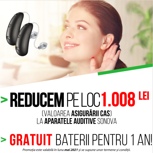 În luna mai, în toate cabinetele, Clarfon reduce pe loc suma de 1.008 lei la achiziționarea oricărui aparatul auditiv SONOVA şi oferă gratuit baterii pentru un an, la aparatul auditiv achiziționat.