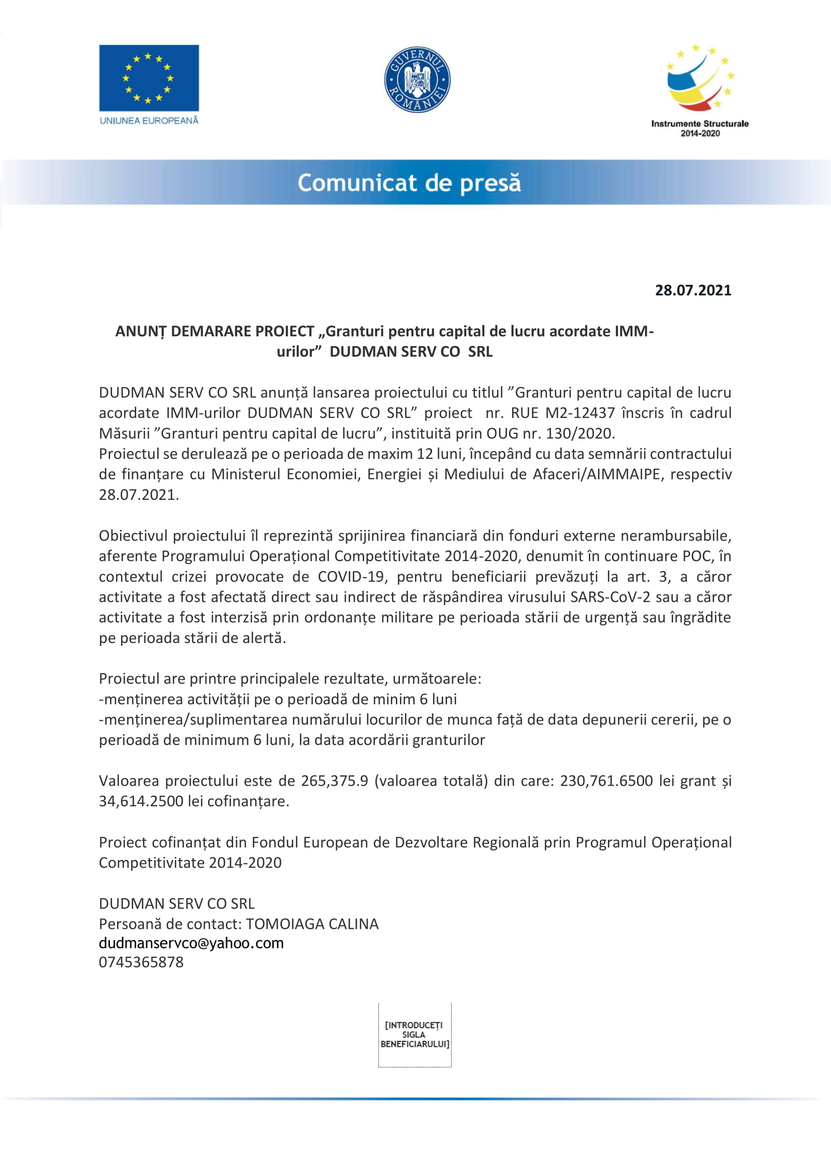 DUDMAN SERV CO SRL anunță lansarea proiectului cu titlul ”Granturi pentru capital de lucru acordate IMM-urilor DUDMAN SERV CO SRL” proiect nr. RUE M2-12437 înscris în cadrul Măsurii ”Granturi pentru capital de lucru”, instituită prin OUG nr. 130/2020.