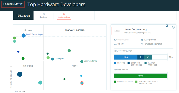 Clutch este o platformă de cercetare de piață B2B care publică conținut bazat pe date, cuprinzând spațiile IT, dezvoltare, marketing și servicii de afaceri. În fiecare an, analiștii platformei evaluează nenumărați furnizori de servicii și îi clasează pe cei mai buni și mai străluciți din industriile respective. Firmele care demonstrează excelență și angajament de neegalat sunt evidențiate în stimata lor Leaders Matrix. În urma cercetărilor din 2022, Lineo Engineering se află în TOP 15 din cei mai buni furnizori B2B care oferă servicii de proiectare și dezvoltare hardware, de clasă mondială.