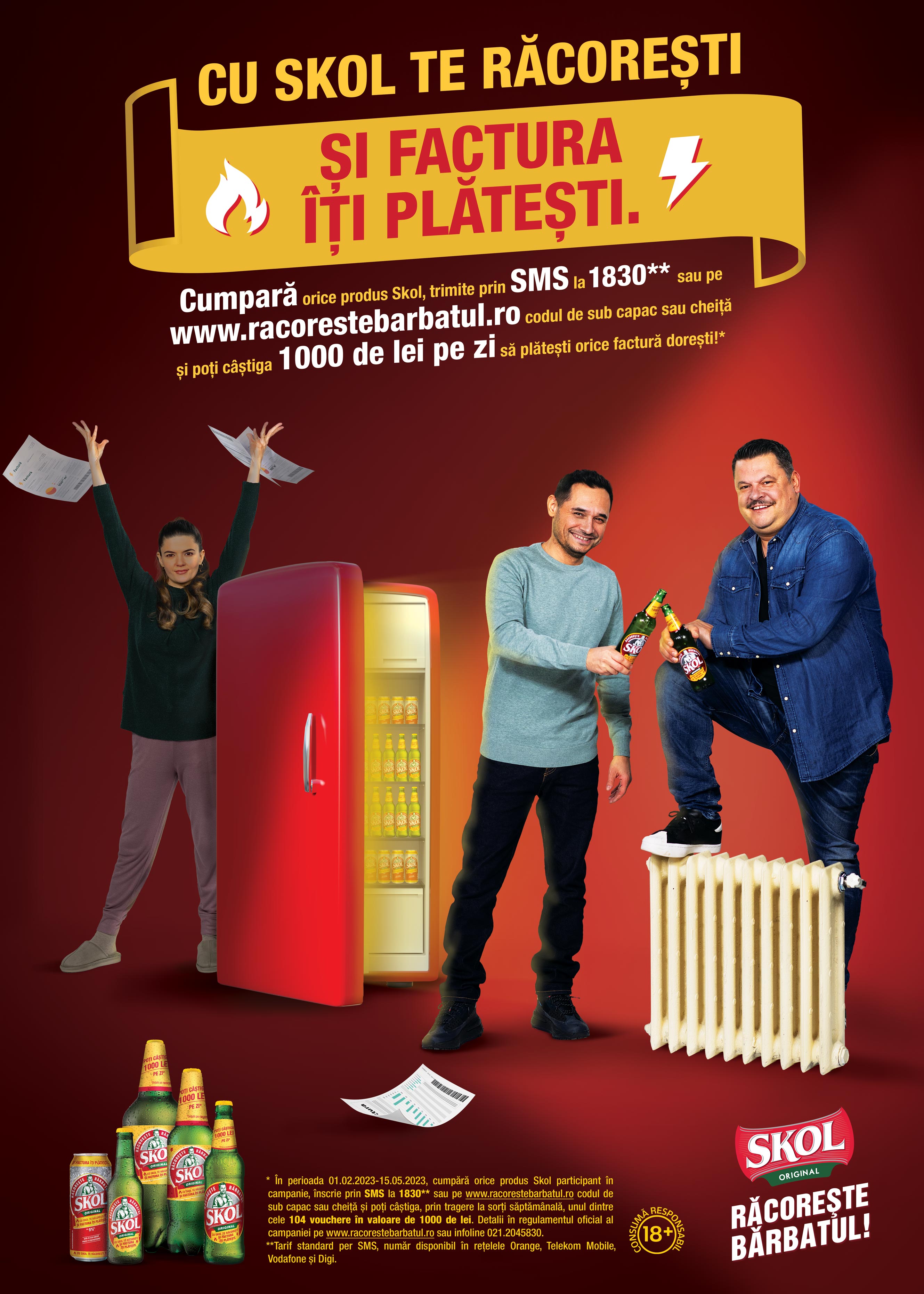 Astfel, într-un moment greu pentru români din punct de vedere financiar, berea lor preferată le este aproape și le vine în ajutor cu plata utilităților. Mecanismul de participare la promoție este simplu: la orice produs Skol cumpărat, sticlă, doză sau pet, codul de sub capac sau cheiță se trimite prin sms la numărul 1830 sau se înscrie pe www.racorestebarbatul.ro, iar cei înscriși pot câștiga, prin tragere la sorți, un voucher de 1000 de lei zilnic pentru plata facturilor.