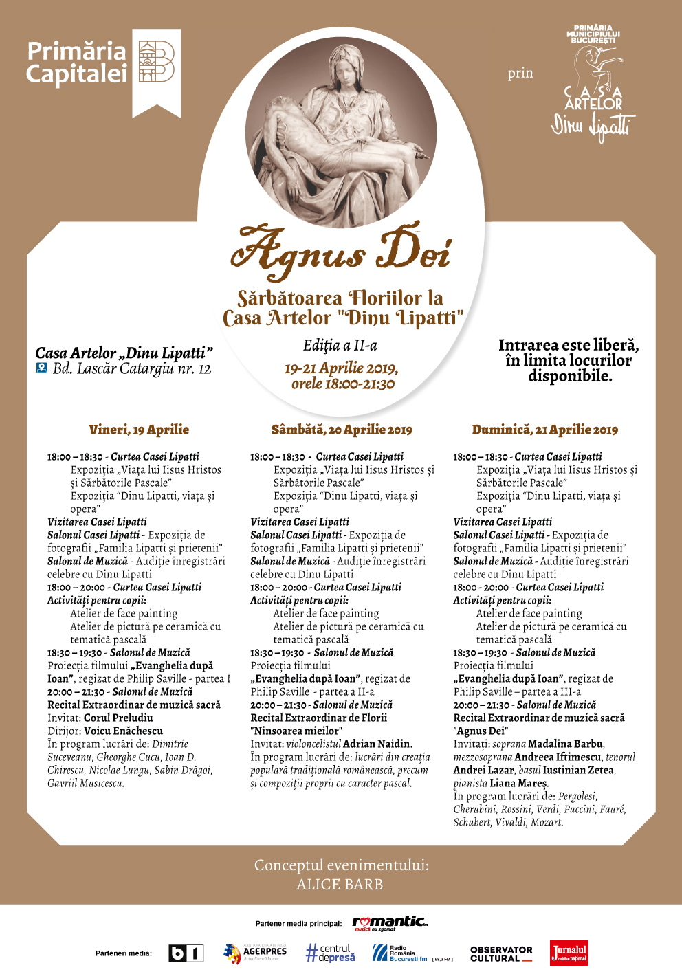 Primăria Municipiului Bucureşti prin Casa Artelor „Dinu Lipatti” vă invită la cea de-a doua ediție a evenimentului Agnus Dei – Sărbătoarea Floriilor la Casa Artelor „Dinu Lipatti” ce va avea loc în perioada 19-21 aprilie 2019, de la orele 18:00-21:00.