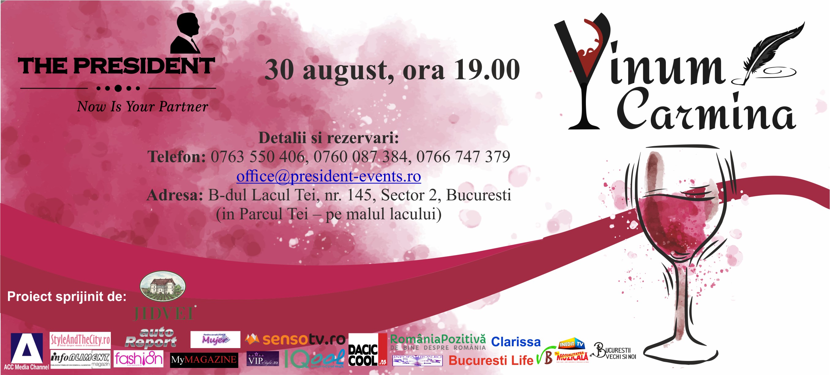Proiectul de educație în cultura vinului cu titlul ”Vinum & Carmina 2018” se desfășoară în perioada iulie-august 2018 și și-a propus să promoveze vinul bun și cultura printr-o serie de evenimente desfășurate pe terasa Veneția, în cadrul Centrului de Evenimente The President.