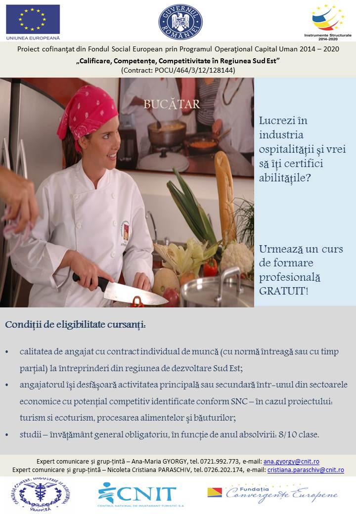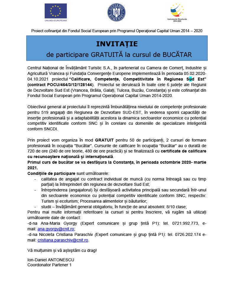 Centrul Național de Învățământ Turistic S.A., în parteneriat cu Camera de Comerț, Industrie și Agricultură Vrancea și Fundația Convergențe Europene implementează în perioada 05.02.2020- 04.10.2021 proiectul “Calificare, Competențe, Competitivitate în Regiunea Sud Est” (contract POCU/464/3/12/128144). Proiectul se derulează în toate cele 6 județe ale Regiunii de Dezvoltare Sud Est (Vrancea, Brăila, Galați, Tulcea, Buzău, Constanța) și este cofinanțat din Fondul Social European prin Programul Operațional Capital Uman 2014-2020.