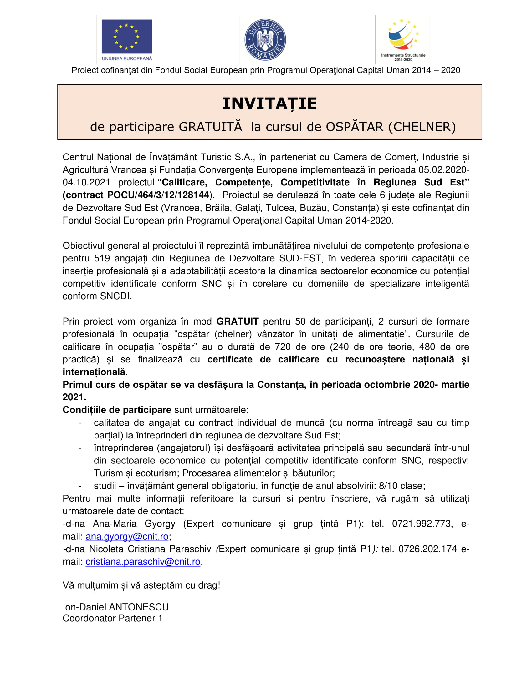 Centrul Național de Învățământ Turistic S.A., în parteneriat cu Camera de Comerț, Industrie și Agricultură Vrancea și Fundația Convergențe Europene implementează în perioada 05.02.2020- 04.10.2021 proiectul “Calificare, Competențe, Competitivitate în Regiunea Sud Est” (contract POCU/464/3/12/128144). Proiectul se derulează în toate cele 6 județe ale Regiunii de Dezvoltare Sud Est (Vrancea, Brăila, Galați, Tulcea, Buzău, Constanța) și este cofinanțat din Fondul Social European prin Programul Operațional Capital Uman 2014-2020.