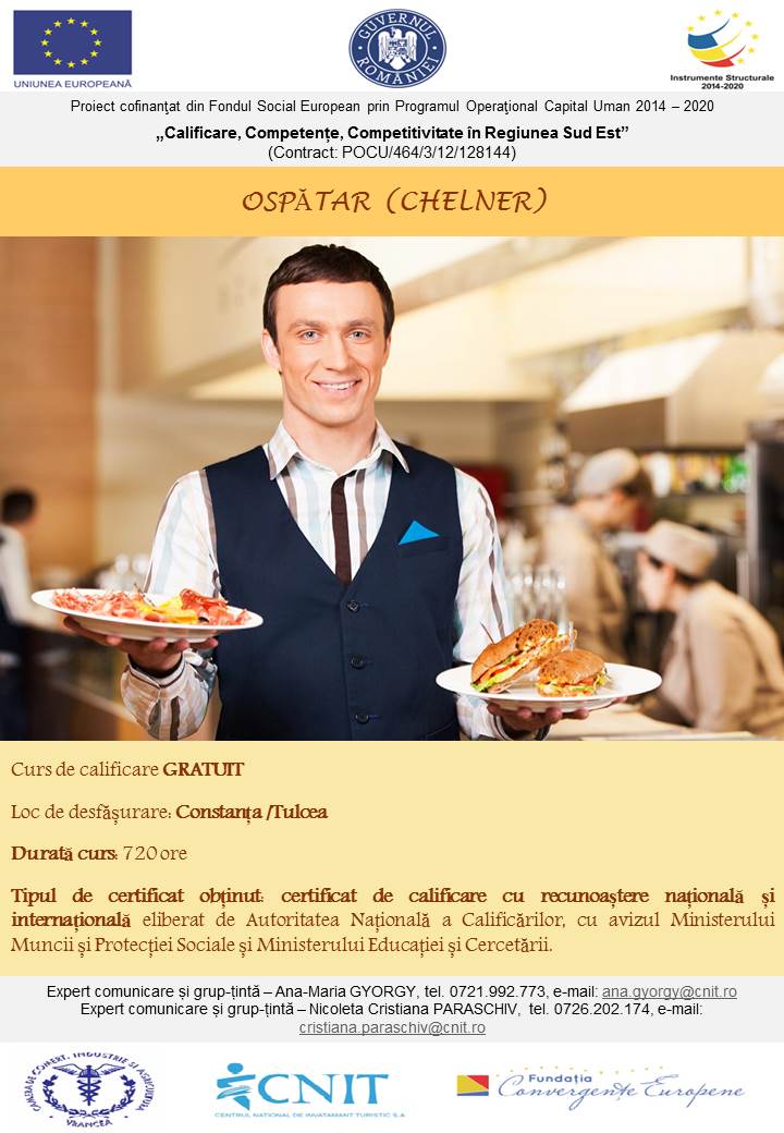 INVITAȚIE de participare GRATUITĂ la cursul de OSPĂTAR (CHELNER)