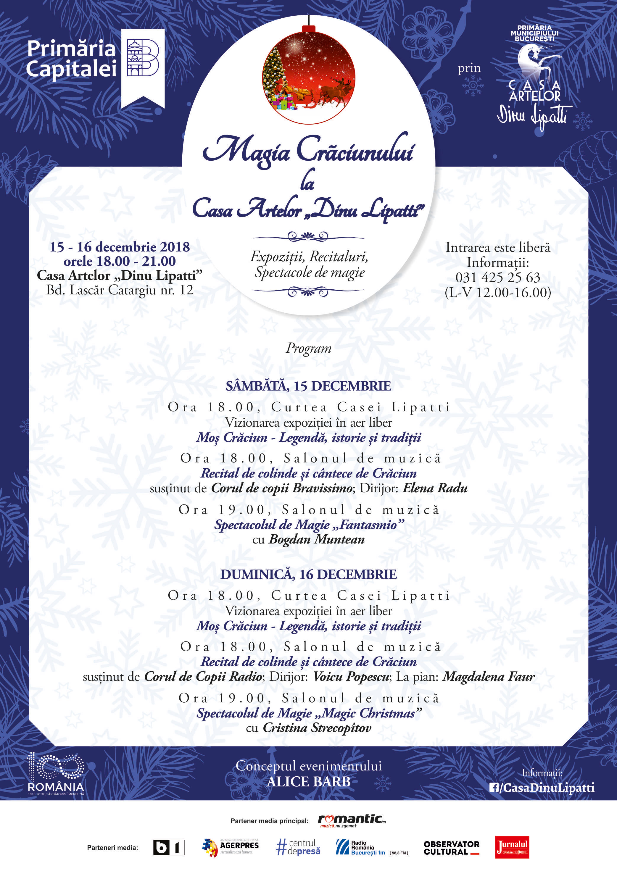 Primăria Municipiului București, prin Casa Artelor „Dinu Lipatti”, are bucuria să vă invite în 15 și 16 decembrie, de la orele 18.00, la evenimentul Magia Crăciunului la Casa Artelor „Dinu Lipatti”, minunat prilej pentru ca magicul brad de Crăciun de la Casa Lipatti să adune în jurul său cât mai mulți copii și cât mai multe dorințe de îndeplinit!